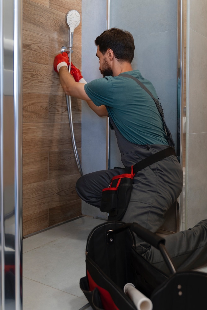 Armaturen und Keramik montieren, Duschabtrennung setzen; elektrische Anschlüsse für Licht, Spiegel, Geräte. (Installateur & Elektriker) -